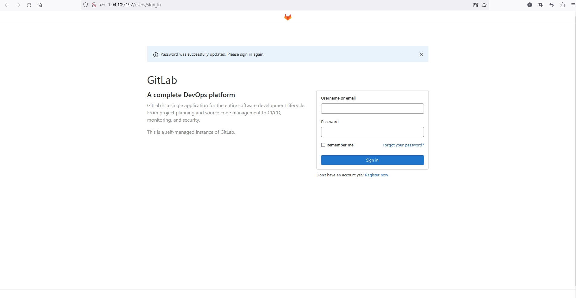 # If the password shown here doesn't work, you must reset the admin password following https://docs.gitlab.com/ee/security/reset_user_password.html#reset-your-root-password.